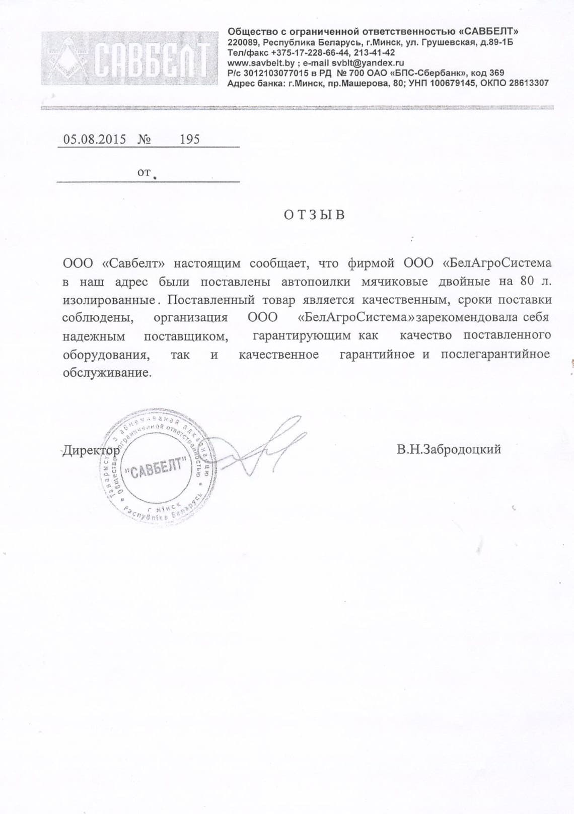 ООО «Савбелт» настоящим сообщает, что фирмой ООО «БелАгроСистема в наш адрес были поставлены автопоилки мячиковые двойные на 80 л. изолированные. Поставленный товар является качественным, сроки поставки соблюдены, организация ООО «БелАгроСистема» зарекомендовала себя надежным поставщиком, гарантирующим как качество поставленного оборудования, так и качественное гарантийное и послегарантийное обслуживание.